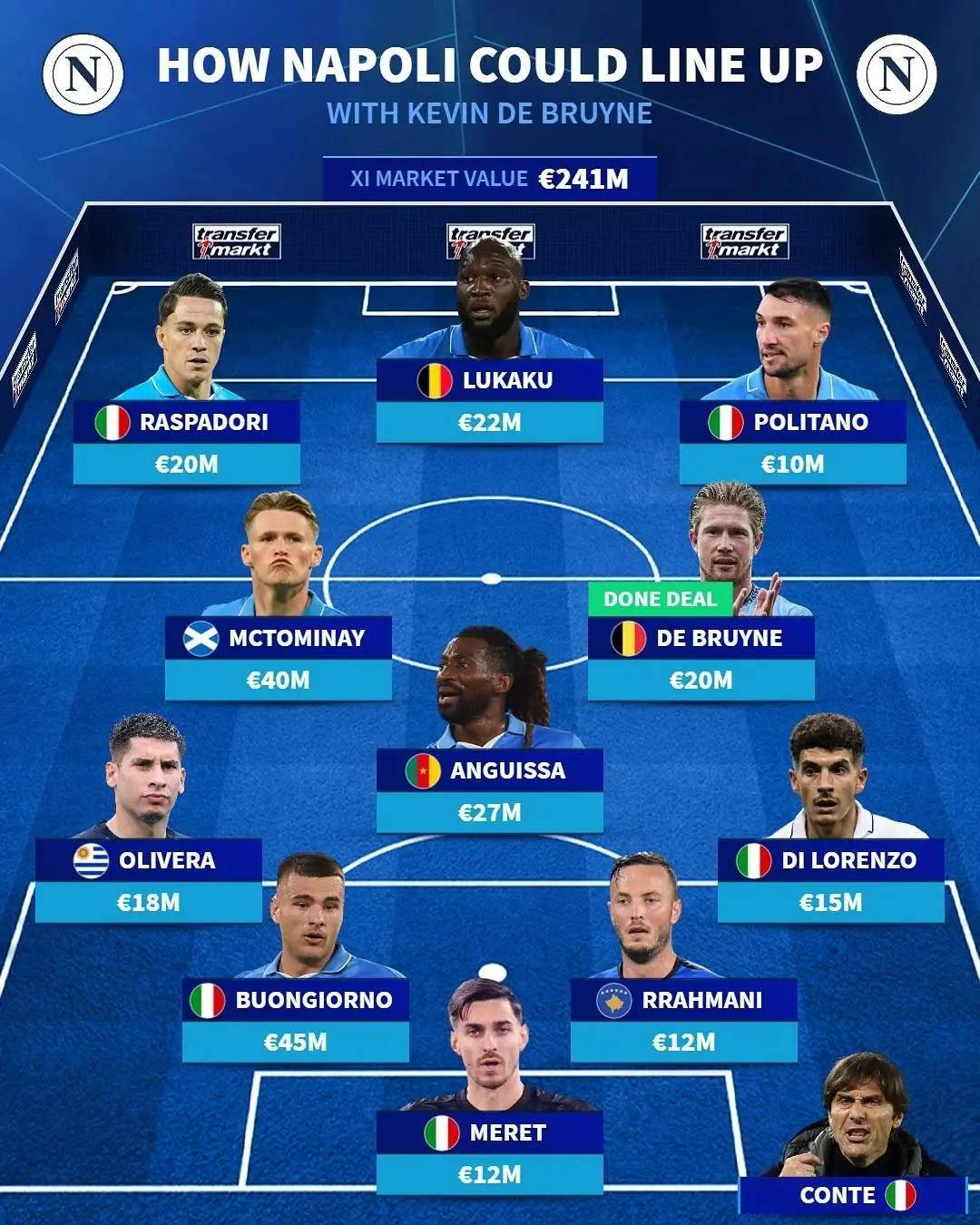 如今,那不勒斯的阵容令人瞩目,共计花费已高达2.41亿欧元。随着金玟哉、克瓦拉茨赫利亚和奥斯梅恩等明星球员的离队,斯帕莱蒂时代的冠军阵容(2022/23)的辉煌暂时掩盖在历史的尘埃之下。然而,德劳伦蒂斯没有放松追求卓越的步伐。在孔蒂的麾下,球队本就有卢卡库、拉斯帕多里、麦克托米奈与安古伊萨等顶级球星,再加上德布劳内和穆萨的加盟,使得球队的整体实力与老对手国际米兰相比丝毫不逊色。